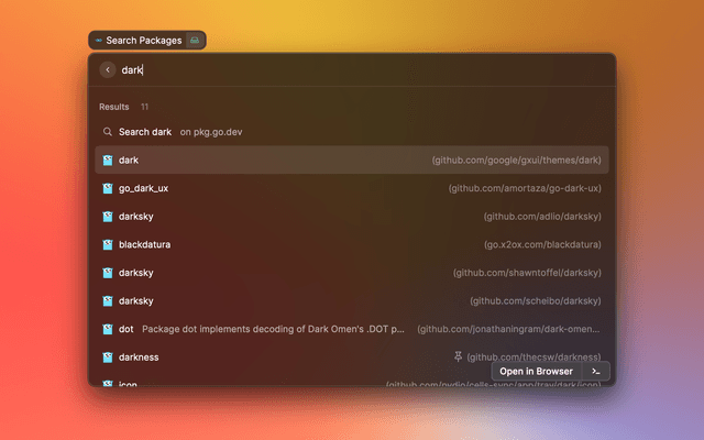 This Raycast extension allows you to search Golang packages on pkg.go.dev.